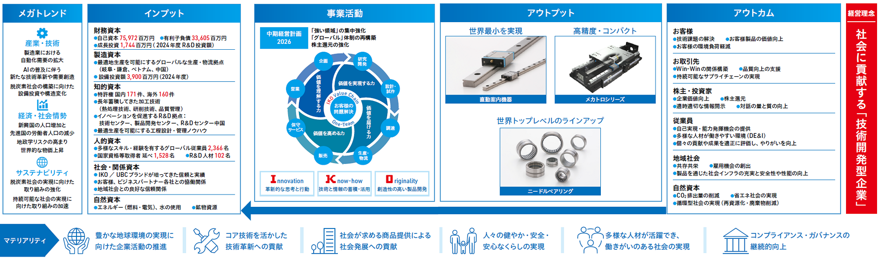 HOME サステナビリティ 日本トムソンの価値創造 価値創造プロセス・源泉 サステナビリティ 日本トムソンの価値創造:価値創造プロセス・源泉 価値創造プロセス・源泉 価値創造の軌跡 価値創造プロセス・源泉 事業戦略 価値創造の軌跡 価値創造プロセス・源泉 事業戦略 価値創造プロセス 日本トムソンはこれまでに培ってきた独自の強みをベースに、バリューチェーン全体で社会の発展に貢献していきます。 *画像クリックで拡大表示できます 価値創造プロセスの解説 当社グループの価値創造は、社員一人ひとりがお客様と同じ目線に立つことから始まります。 パートナー企業を含むバリューチェーン全体の「価値機能」がスピーディーかつタイムリーに繋がることで、持続的な価値創造を実現しています。